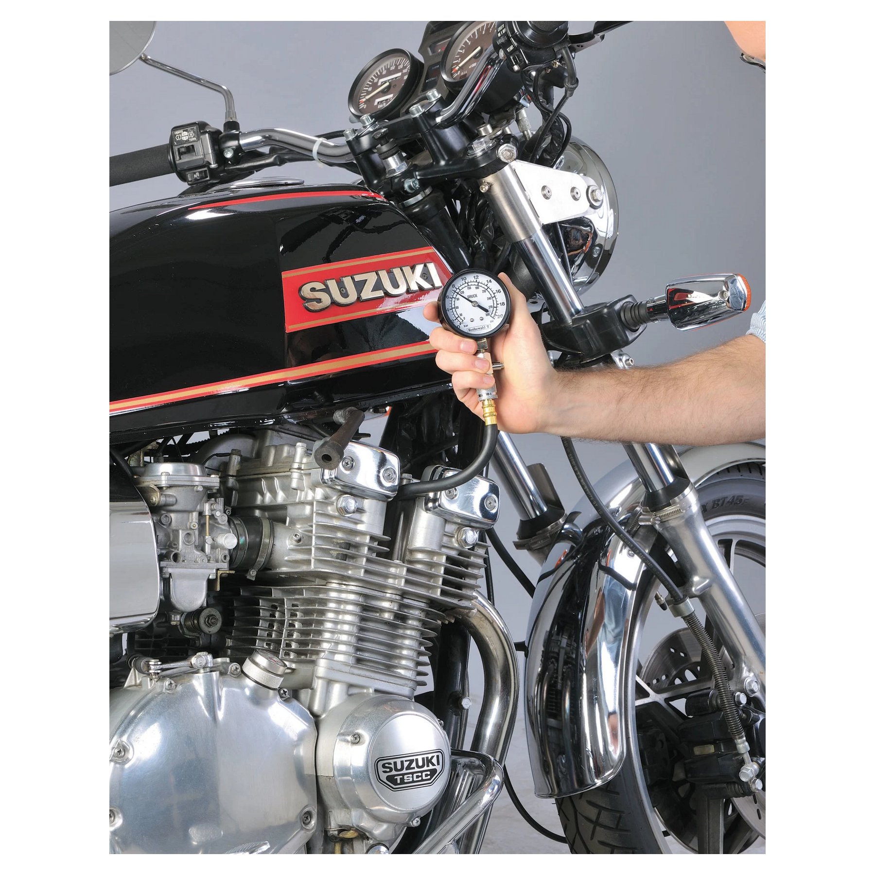 • Dostawa obejmuje 3 węże gumowe z mosiężnymi adapterami na gwinty świec zapłonowych 10, 12 i 14 mm oraz zestaw zapasowych zaworów i o-ringów